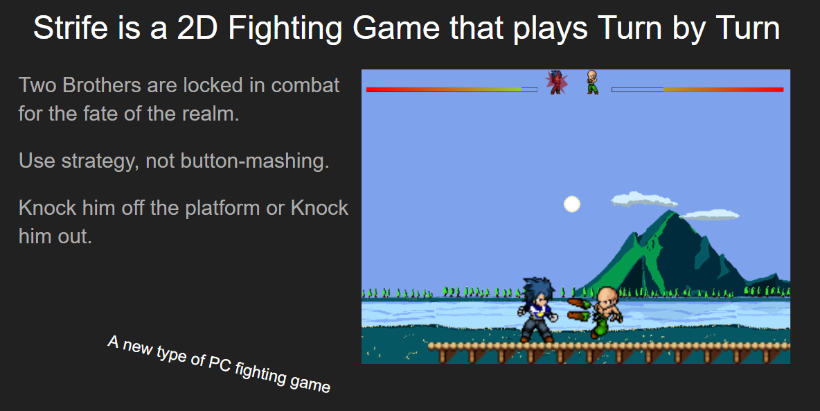 Strife is a 2D Turn-Based Fighting game where 2 players fight each other to determine the fate of the kingdom.