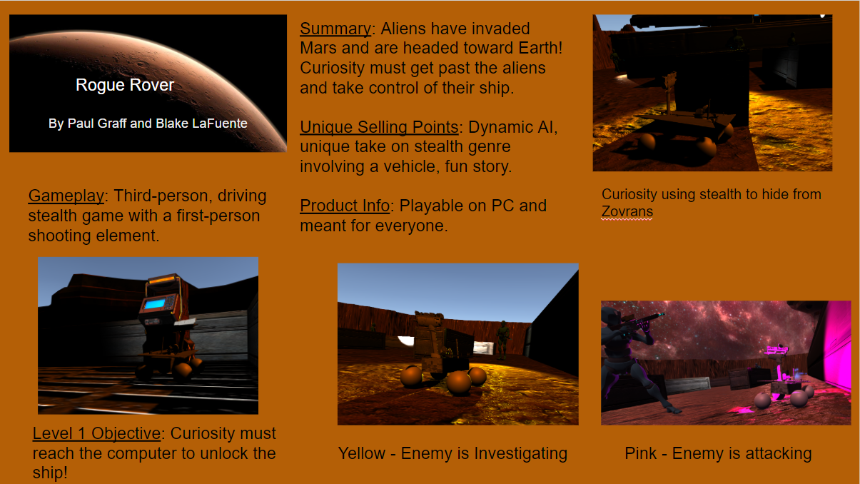 Rogue Rover is a 3D stealth game where the player controls a rover that must sneak past aliens and prevent an invasion of Earth.